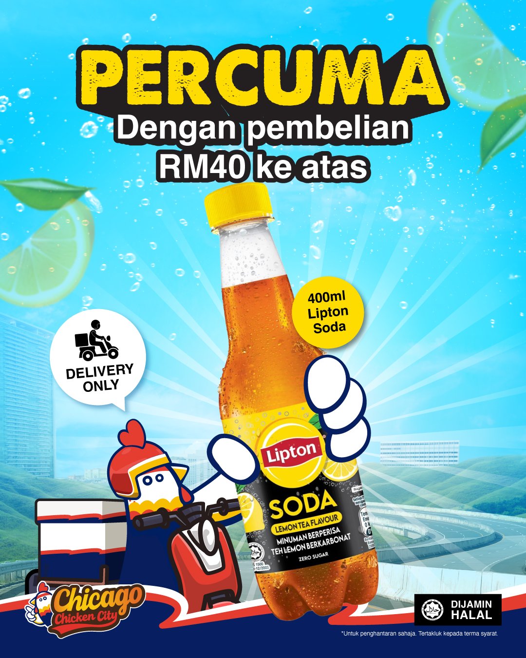 Dapatkan Lipton Soda 400ml PERCUMA dengan mana-mana pembelian delivery RM40 & ke atas di semua restoran CCC.